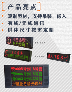 采用φ3.75/φ5.0,LED点阵显示屏,单/双色;定制嵌入式铝型材制作, 表面加 膜,防反光处理;长*高*厚=950*192*50mm,左边二个模块可显示窗口序号;第一行显示业务信息,第二行显示欢迎信息,叫号时切换服务序号;重:约4KG;电源输入:220VAC,功率:小于150W。(样品规格2行12 字嵌入式)