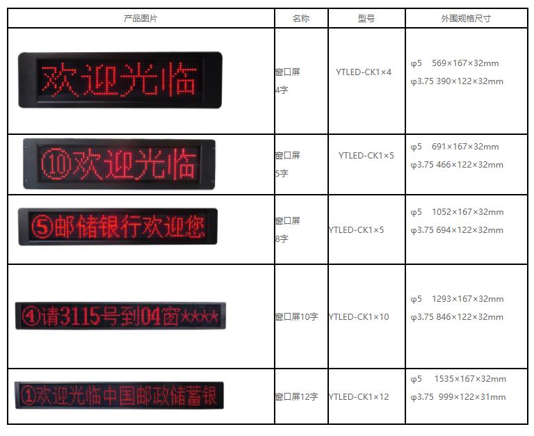 窗口显示屏规格有φ3.75、φ5.0,16点阵、24点阵,4字、5字、8字、10字、12字、16字、单行及多行等各种规格。每个窗口一个,LED汉字显示,可以显示提示信息和当前窗口被呼叫的客户号码。